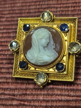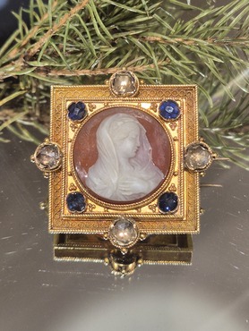 a superb cameo depicting the bust of a woman with headscarf, very fine filligree, rope wire and granulation to the mount, set with 4 sapphires and 4 rose cut diamonds, high carat gold, French stamp