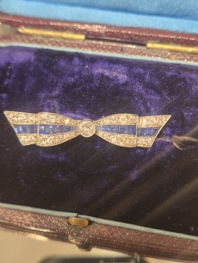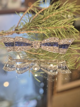 A lovely bow brooch centered on an old cut diamond and set with a central row of calibre cut sapphires flanked above and below with old cut diamonds, circa 1910