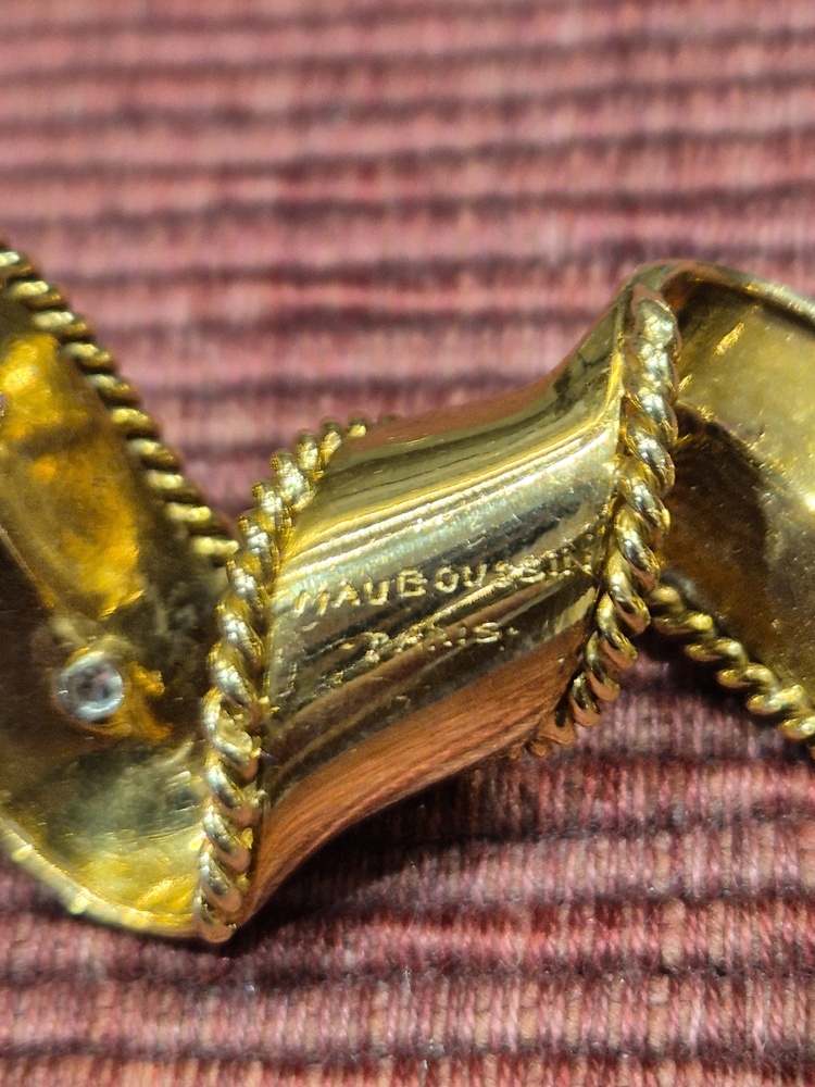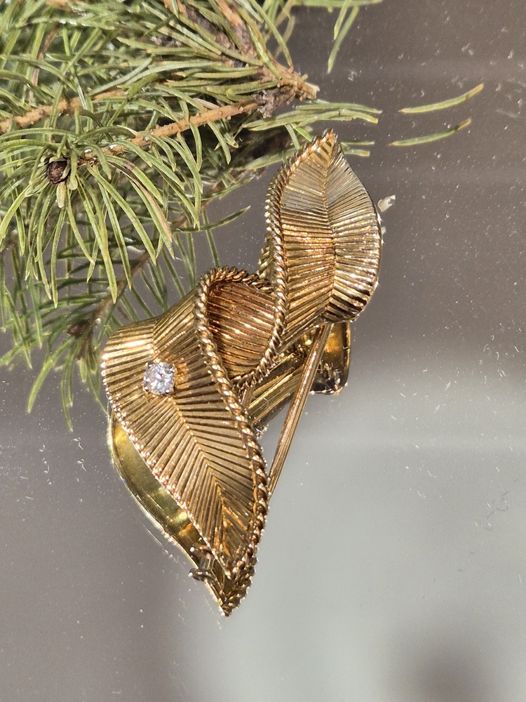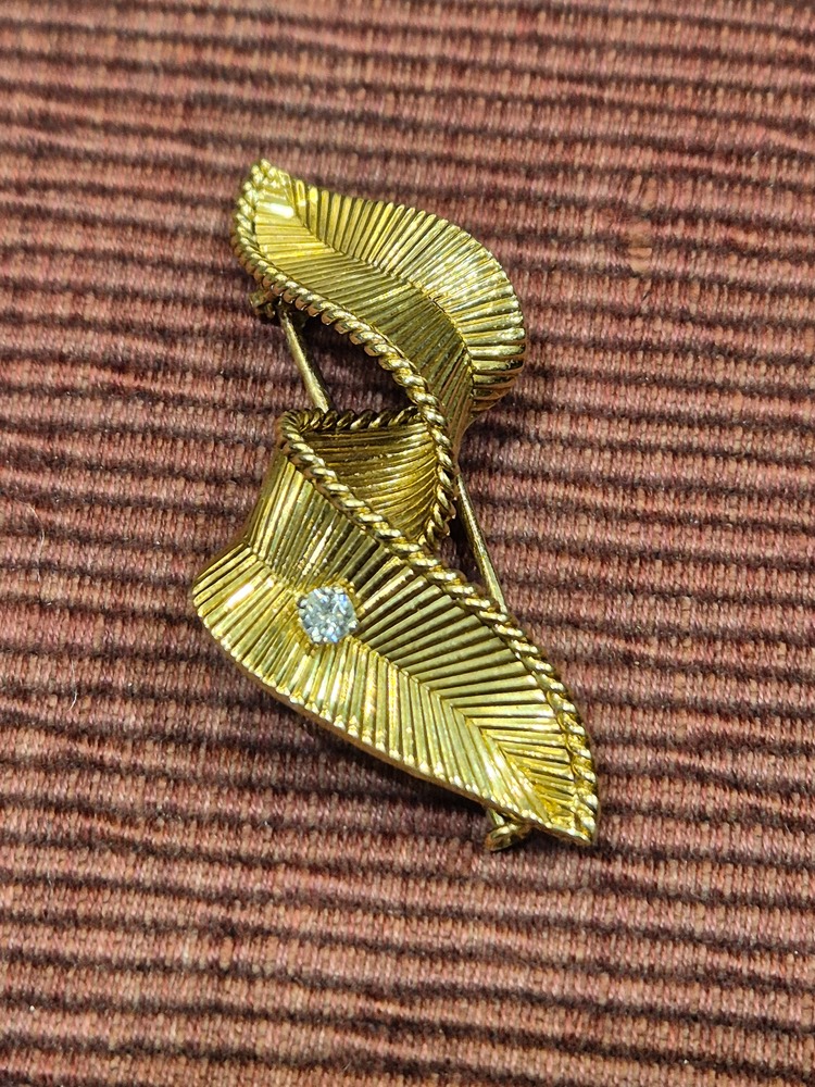 A beautiful vintage twisted feather brooch in 18ct yellow gold set with a diamond, signed for Mauboussin, French stamps