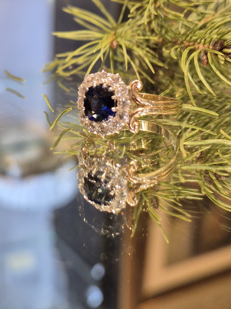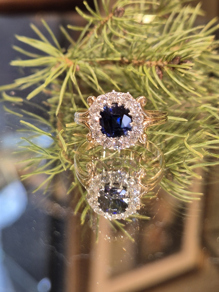cushion cut sapphire and diamond ring with scroll shoulders