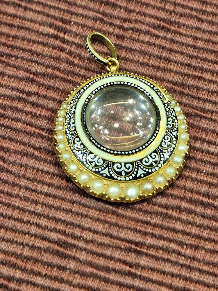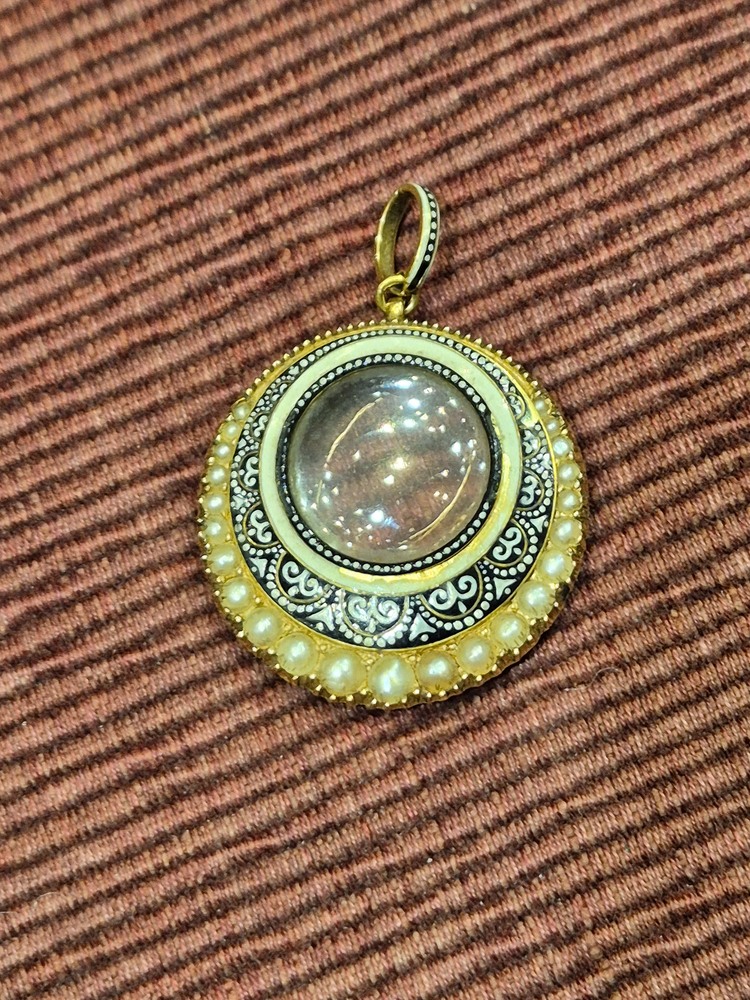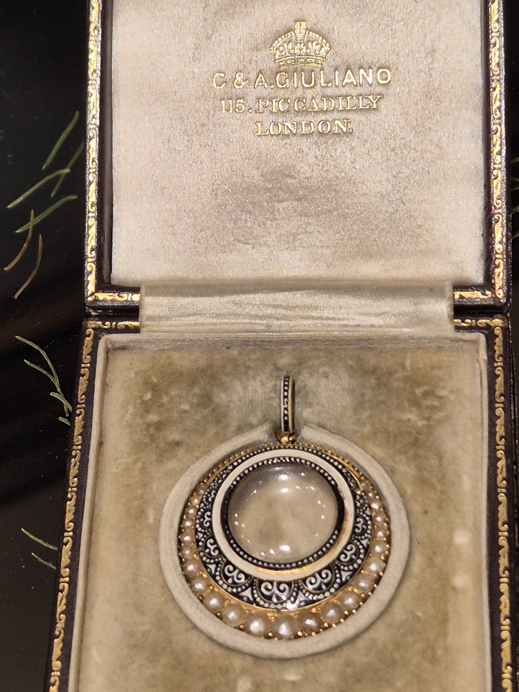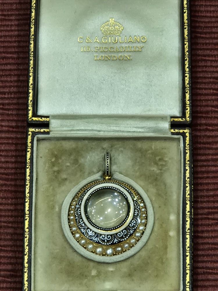 beautifully enamelled in distinctive Giuliano style with a crescent shaped border of natural pearls around a crystal compartment that can be opened, makers mark Carlo & Arthur Giuliano with fitted case from C&A Giuliano.