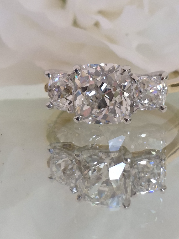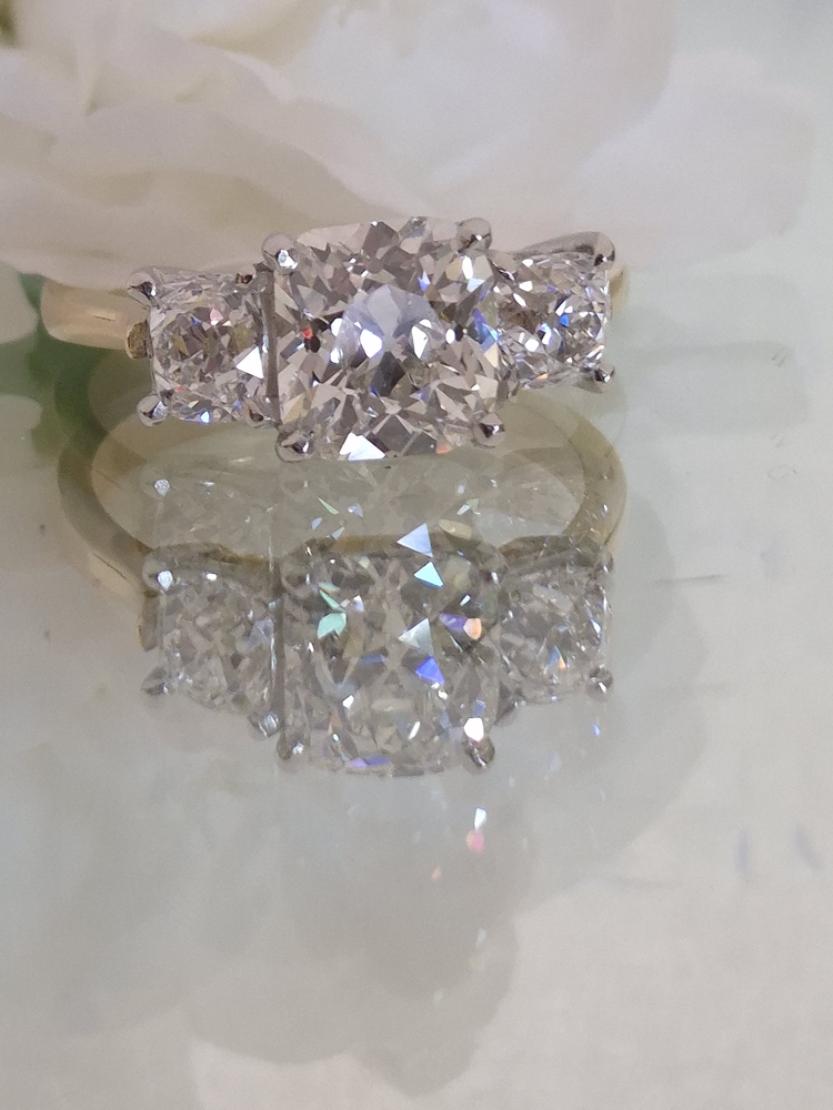 This is a stunning ring. 3 old mine cut diamonds, 0.54cts, 2.08cts and 0.56cts set in platinum to 18ct yellow gold