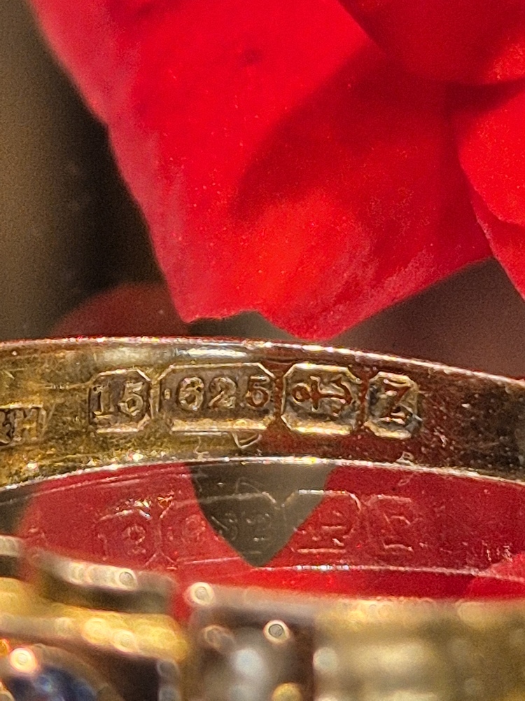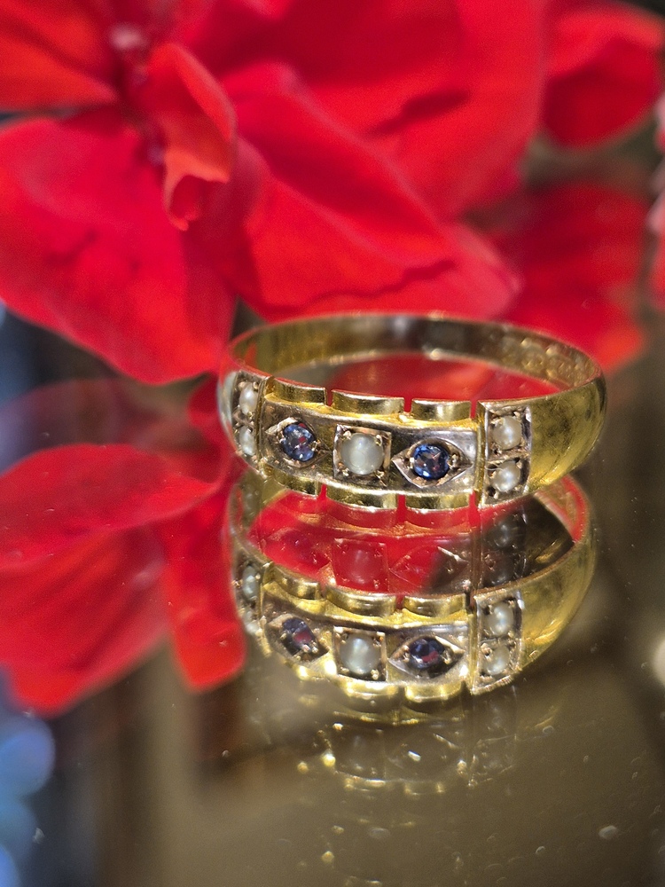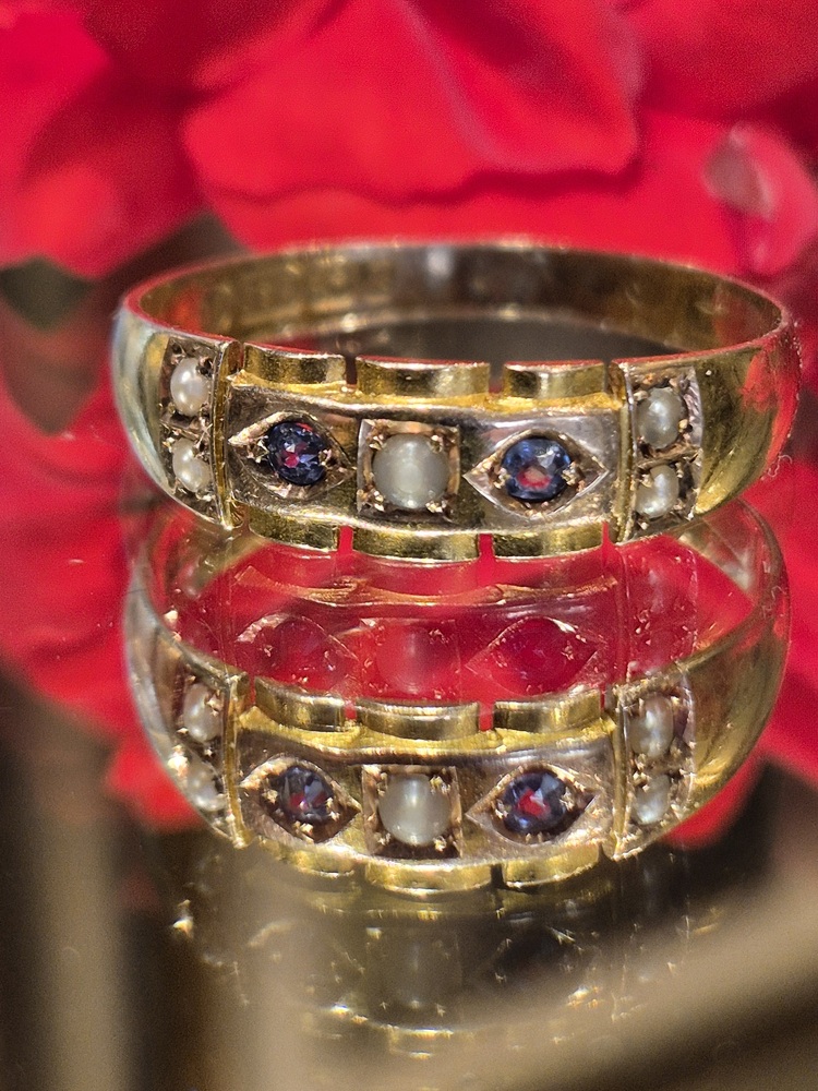 very sweet 15ct yellow gold seed pearl and sapphire ring, hallmarked for Birmingham 1899