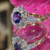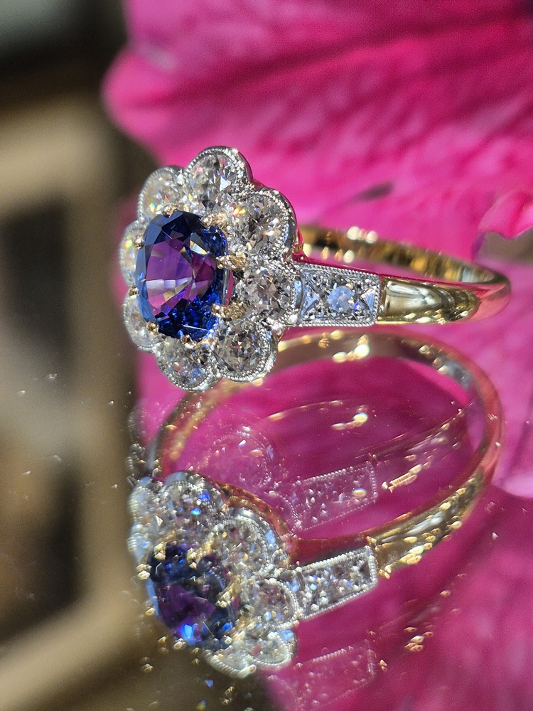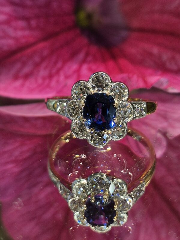 blue sapphire 1.05ct with a border of old cut diamonds and old cut diamond shoulders, 068ct, platinum and 18ct yellow gold