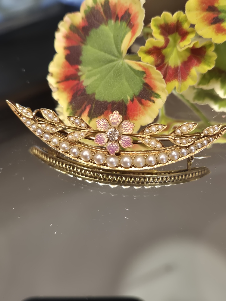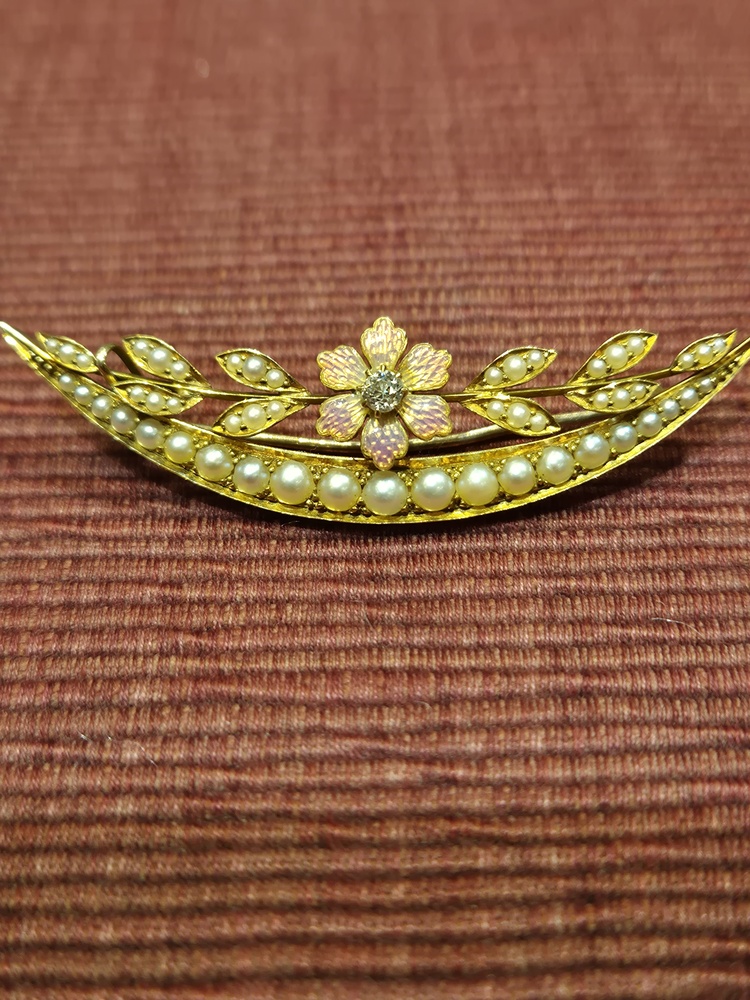 high carat yellow gold crescent brooch set with seed pearls to an enamel petal center set with an old cut diamond, circa 1895