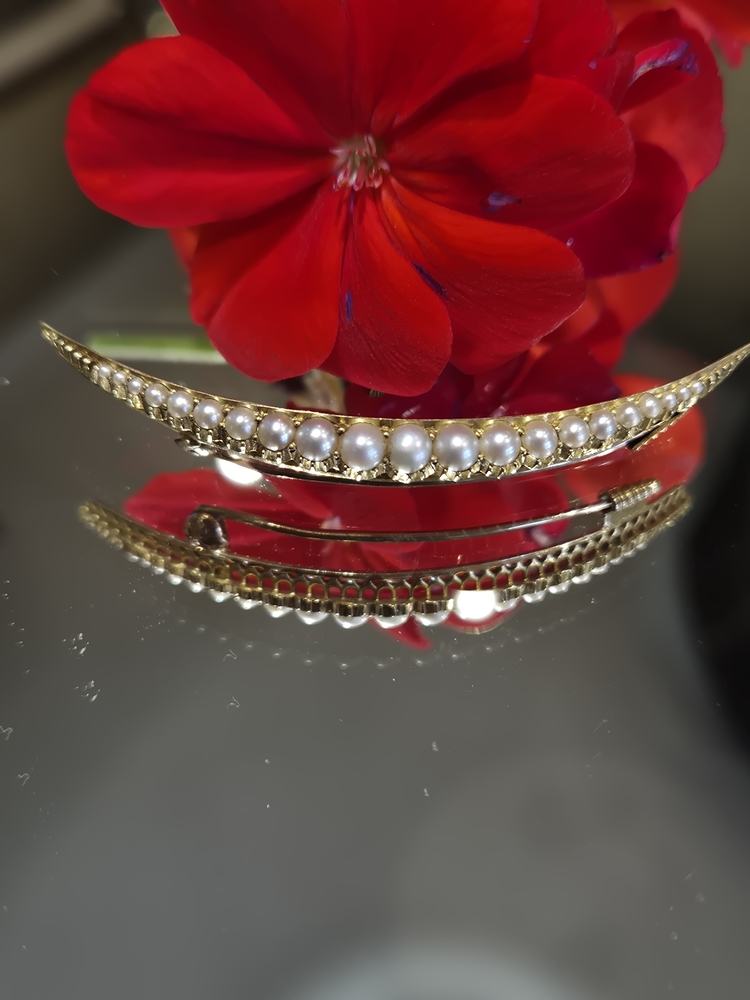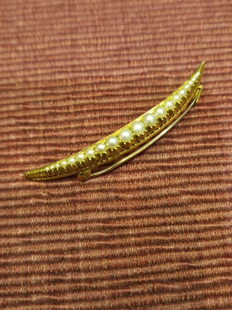 Hi carat yellow gold crescent brooch set with seed pearls circa 1890