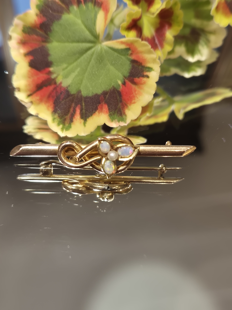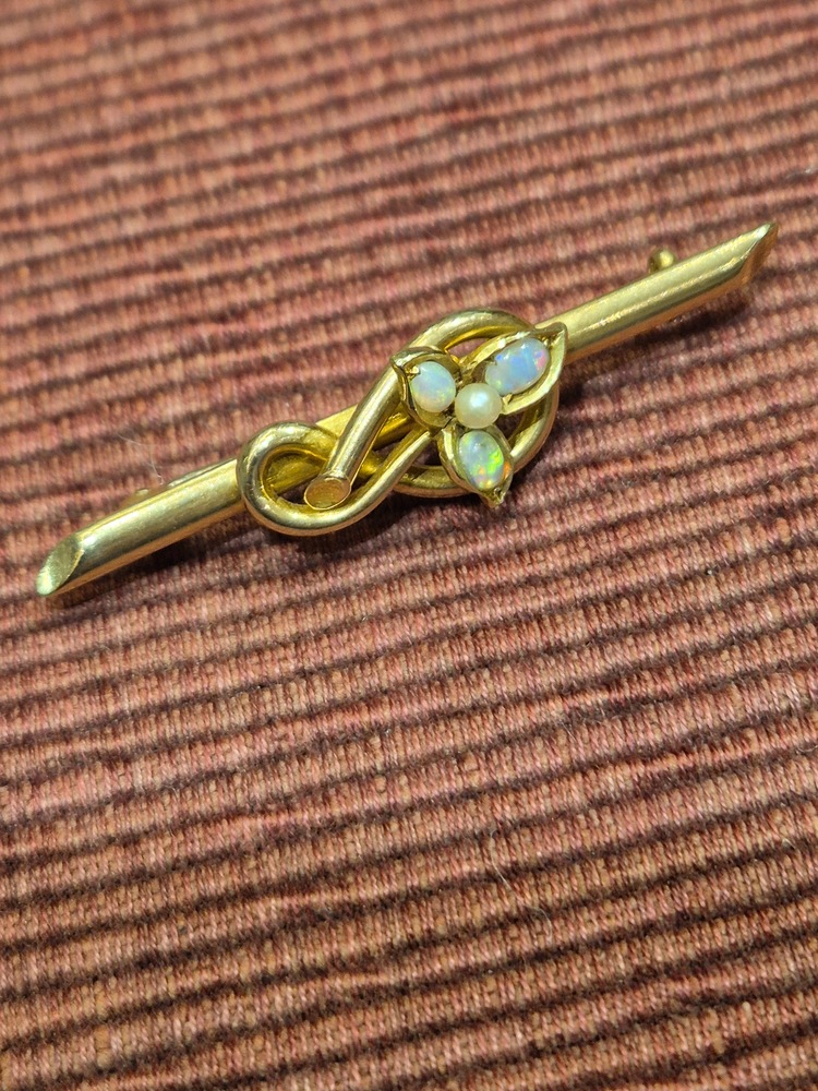 late Victorian 15ct yellow gold bar brooch with an opal and seed pearl leaf spray