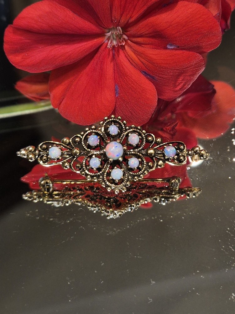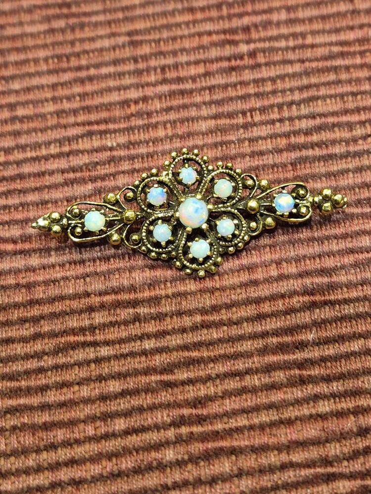 14ct gold brooch set with cabochon opals and granulation decoration to the edges