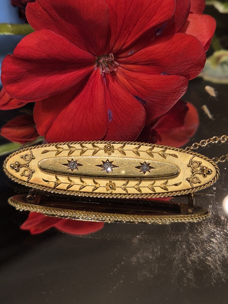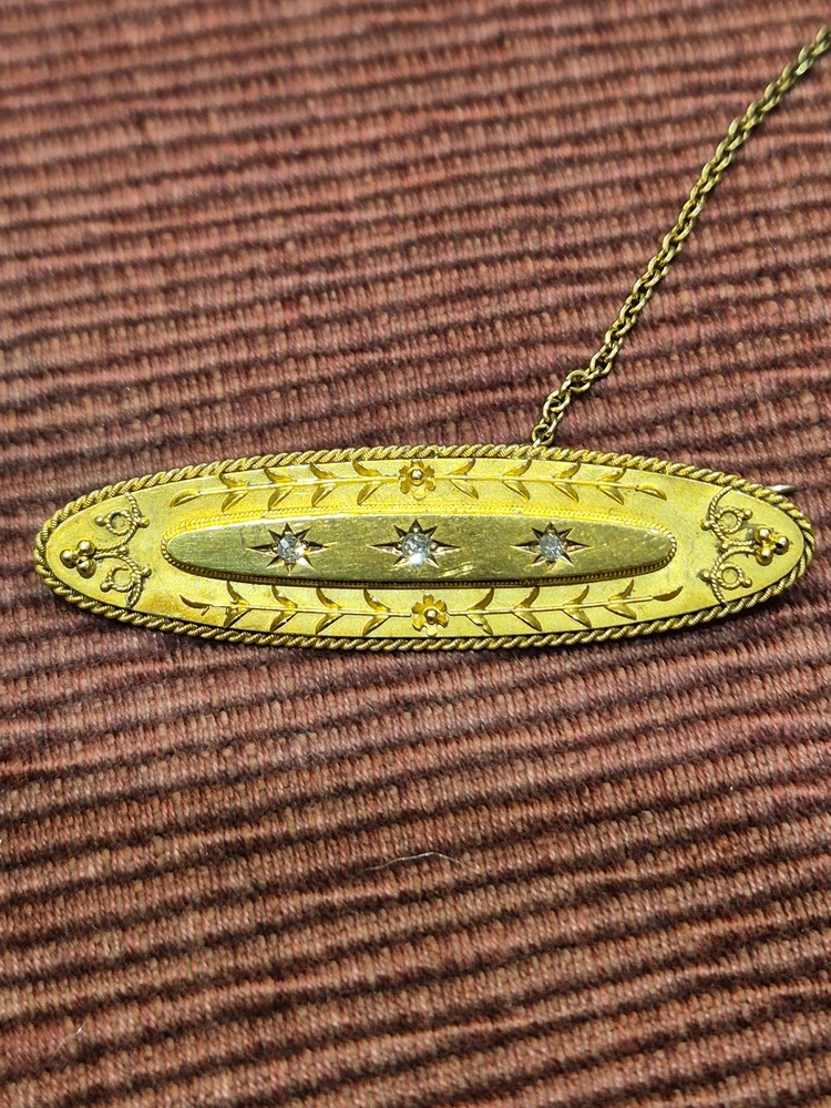 15ct yellow gold oval brooch with filligree and wire decoration set with old cut diamonds, Birmingham 1900
