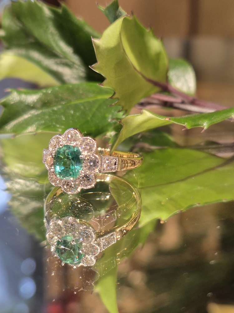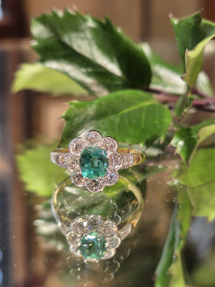 0.81ct emerald within a surround of old European cut diamonds and diamond shoulders, platinum/18ct gold