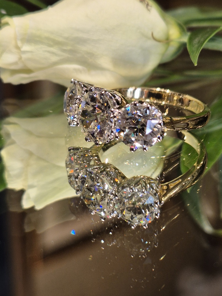 3 old cut diamonds, the center diamond 1.88cts 2 side diamonds 2.63cts, claw set in platinum to 18ct yellow gold, 451cts total. POA