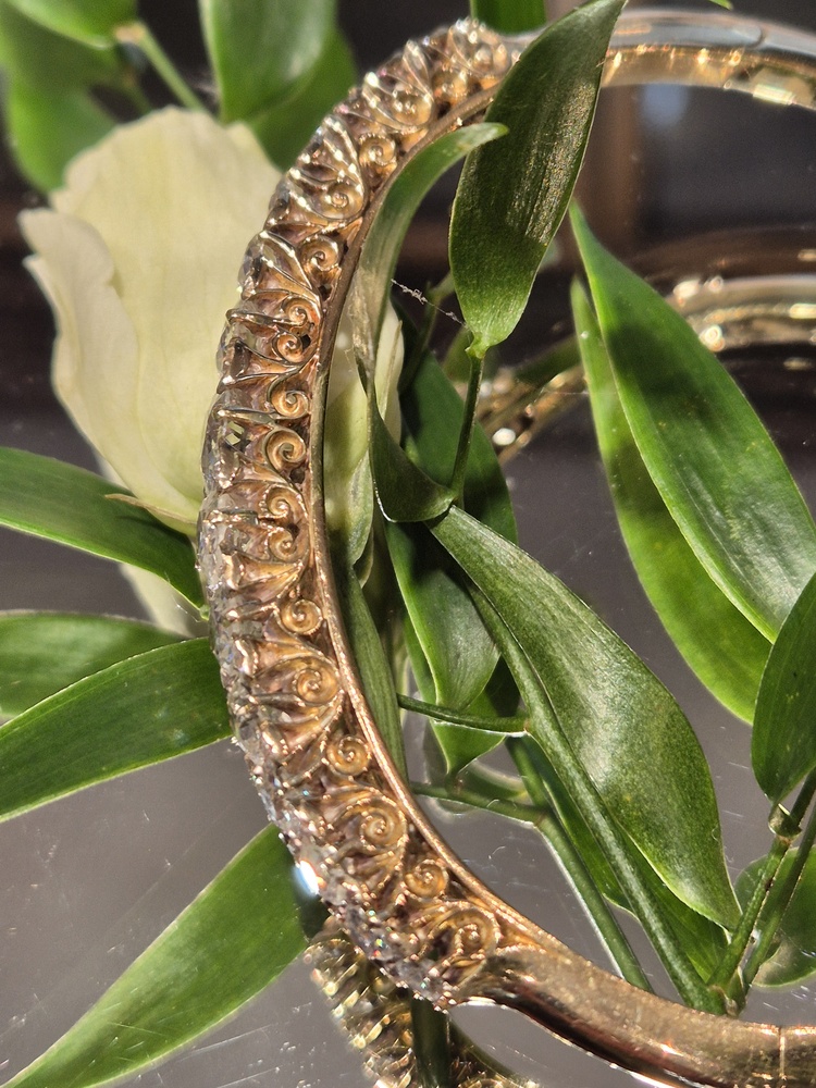 9ct rose gold etched ‘slave’ bangle, not hinged. SOLD