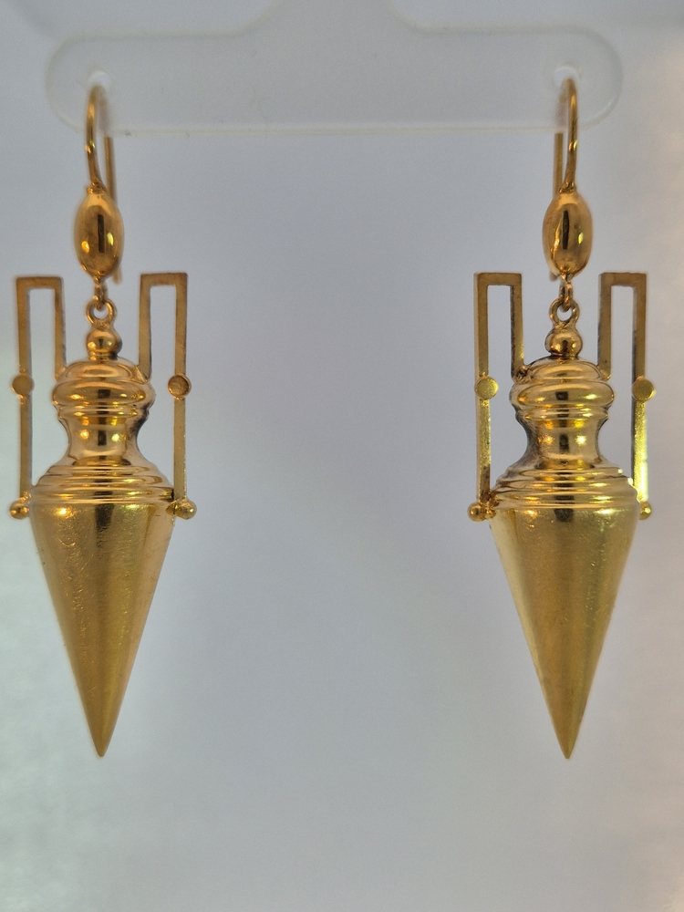 Circa 1875, a fabulous pair of 15ct yellow gold amphora drop earrings