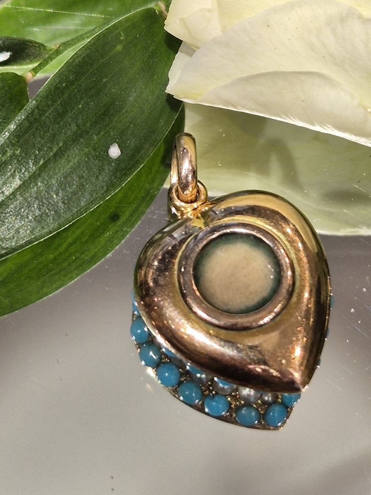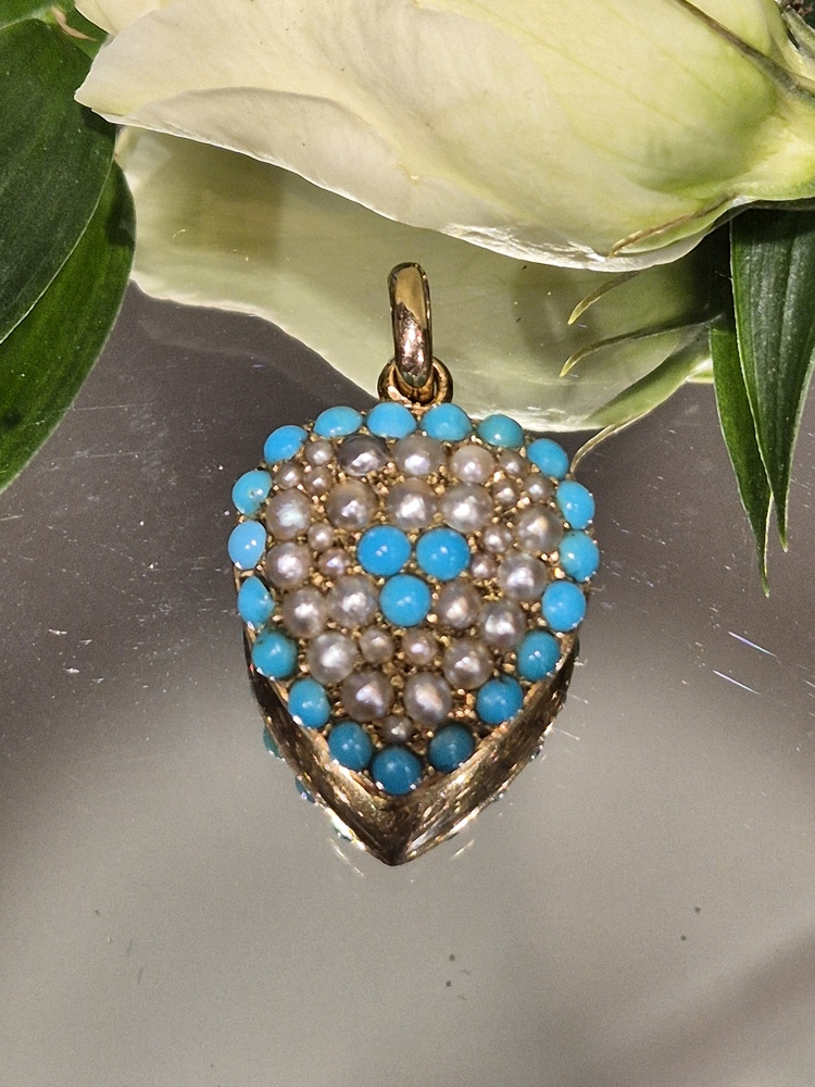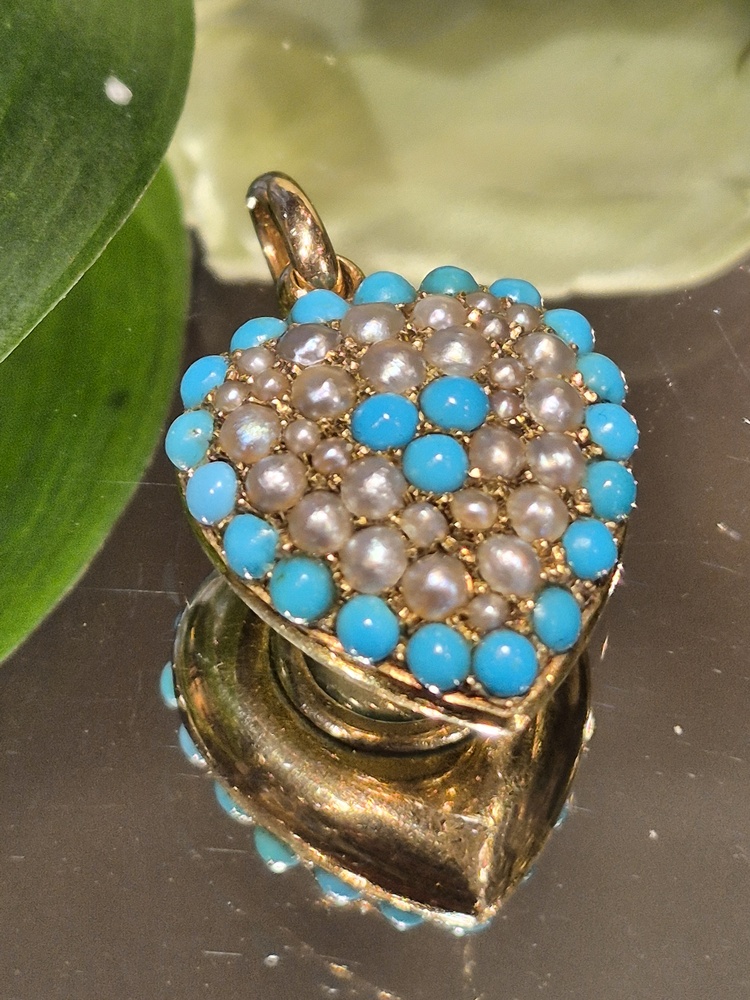 Victorian turquoise and seed pearl heart pendant with chain. SOLD