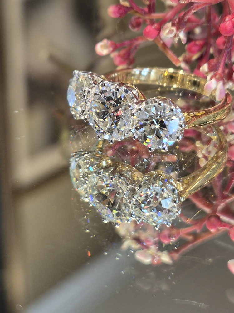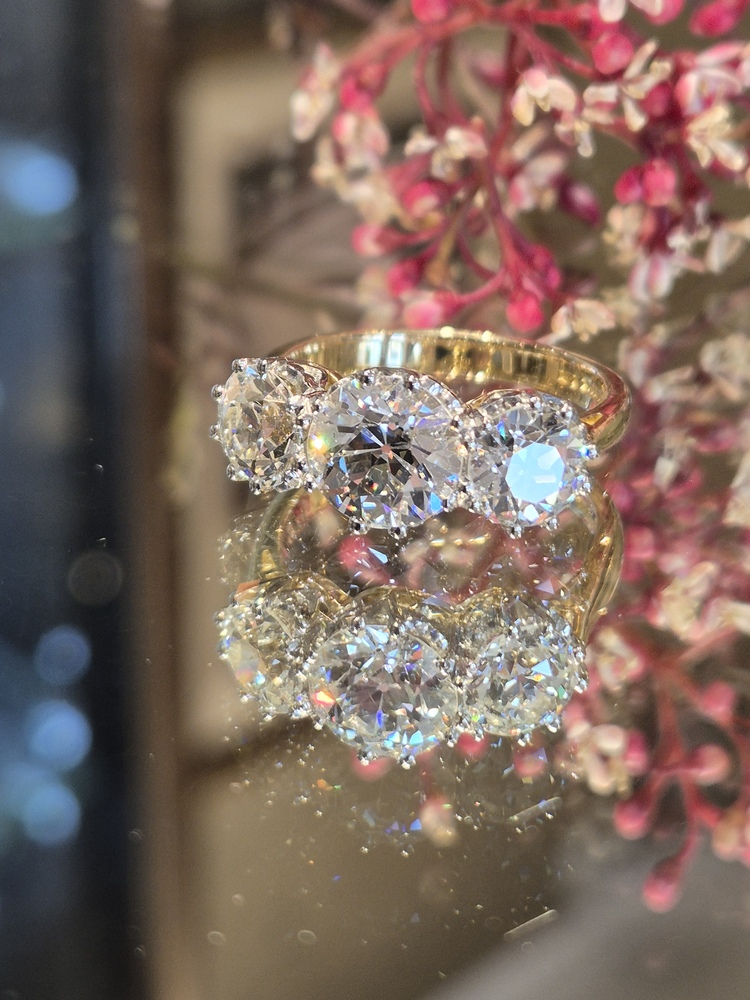 old cut diamond, 1.86cts, flanked by 2 old cut diamonds, 2.05cts, claw set in platinum to an 18ct yellow gold shank