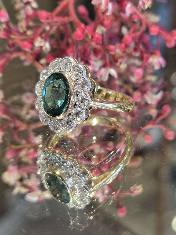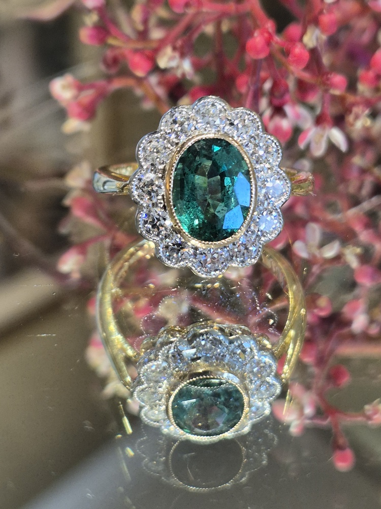 fabulous colour 1.86ct emerald collet set in 18ct yellow gold within a border of old cut diamonds, 0.79ct, collet set in platinum, to an 18ct yellow gold shank