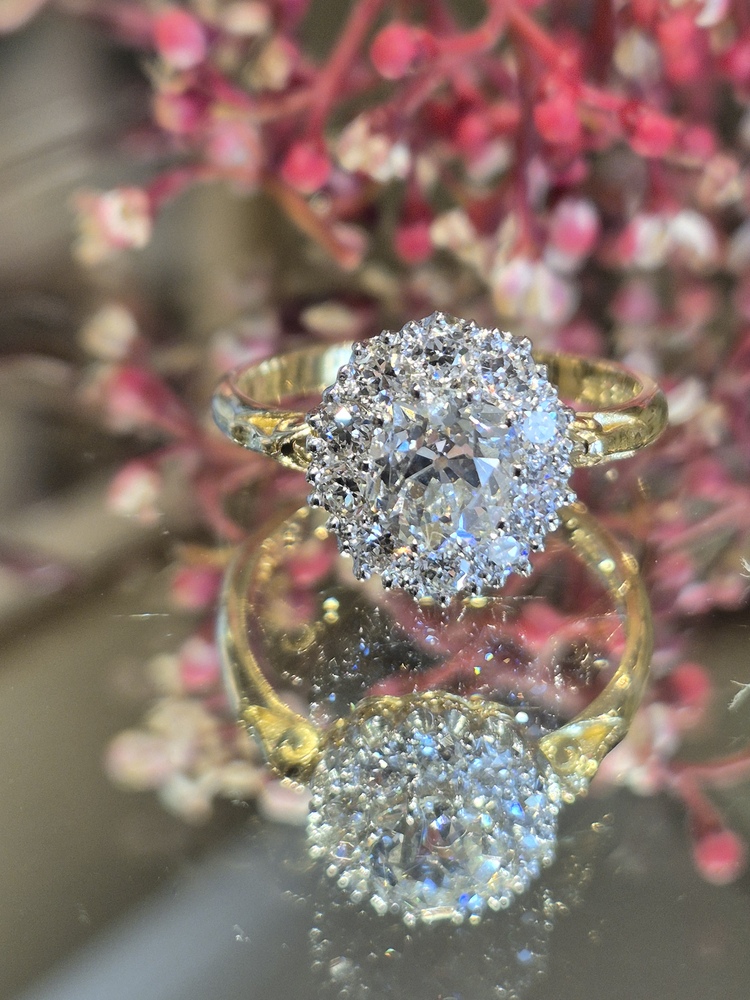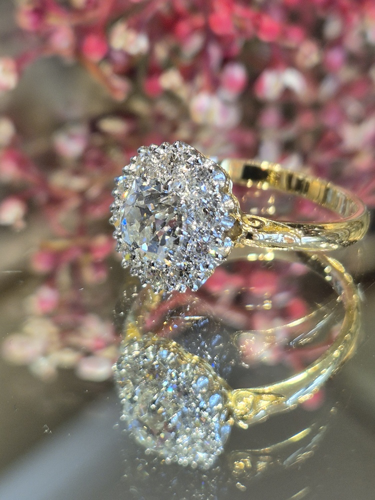 1.13ct old cut diamond within a border of old cut diamonds, 0.45cts, platinum set to 18ct yellow gold