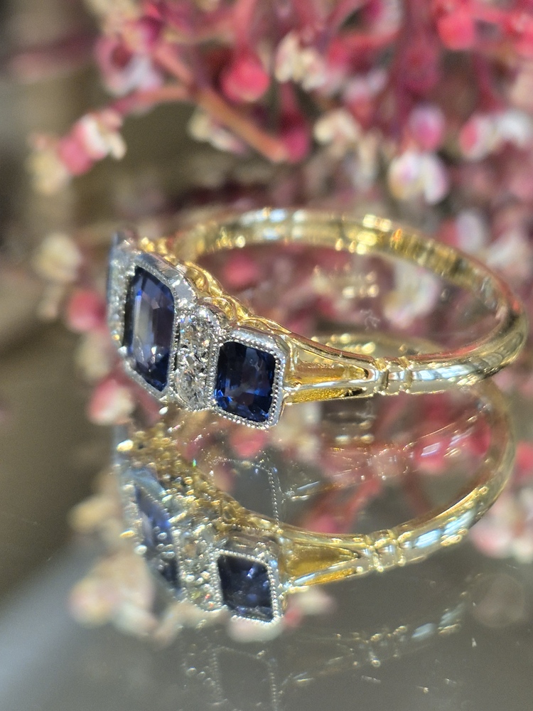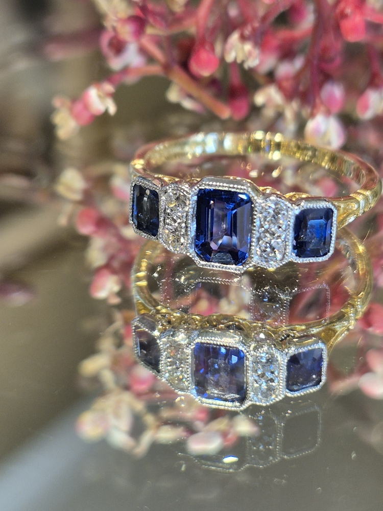 three beautiful sapphires set with old cut diamonds, sapphire weight 1.47ct, diamond weight 0.11ct, 18ct yellow gold