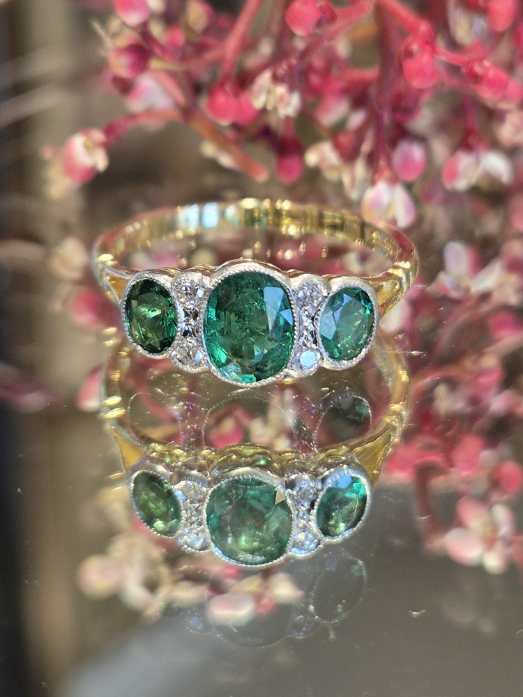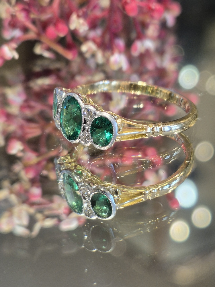 3 emeralds, 1.14ct, with old cut diamonds, 0.06ct, platinum set to 18ct yellow gold